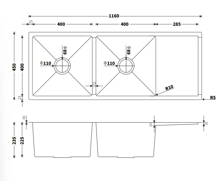 1160 Handmade Double Bowl Sink With Drainer