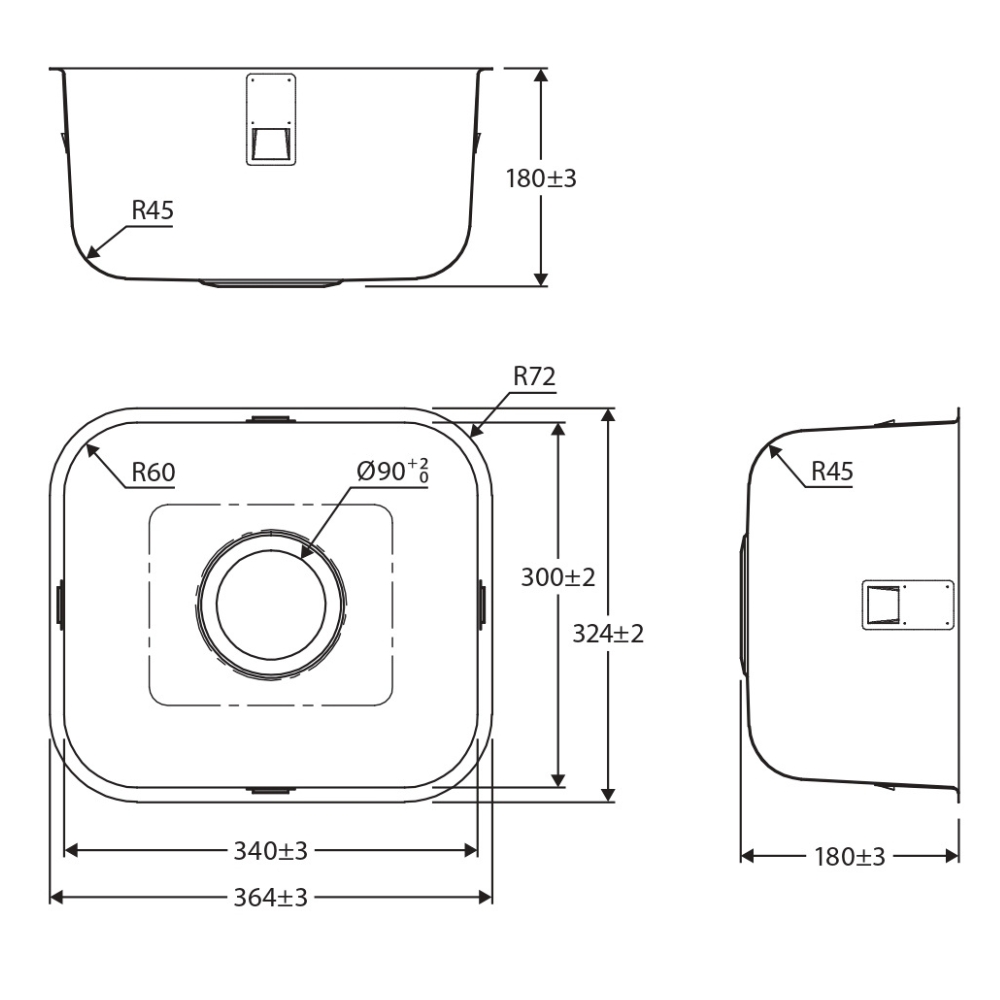 - Overall size: 364 L x 324 W x 180 D mm